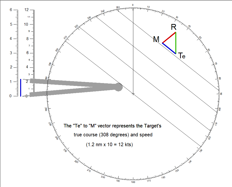 Own ship and target True Motion vectors do not show where these vessels are or where they were in the past. They are simply pieces of data in a math "formula". These vectors can be plotted anywhere, but it is convenient to use the Releative (R) Motion (M) vector as a base.