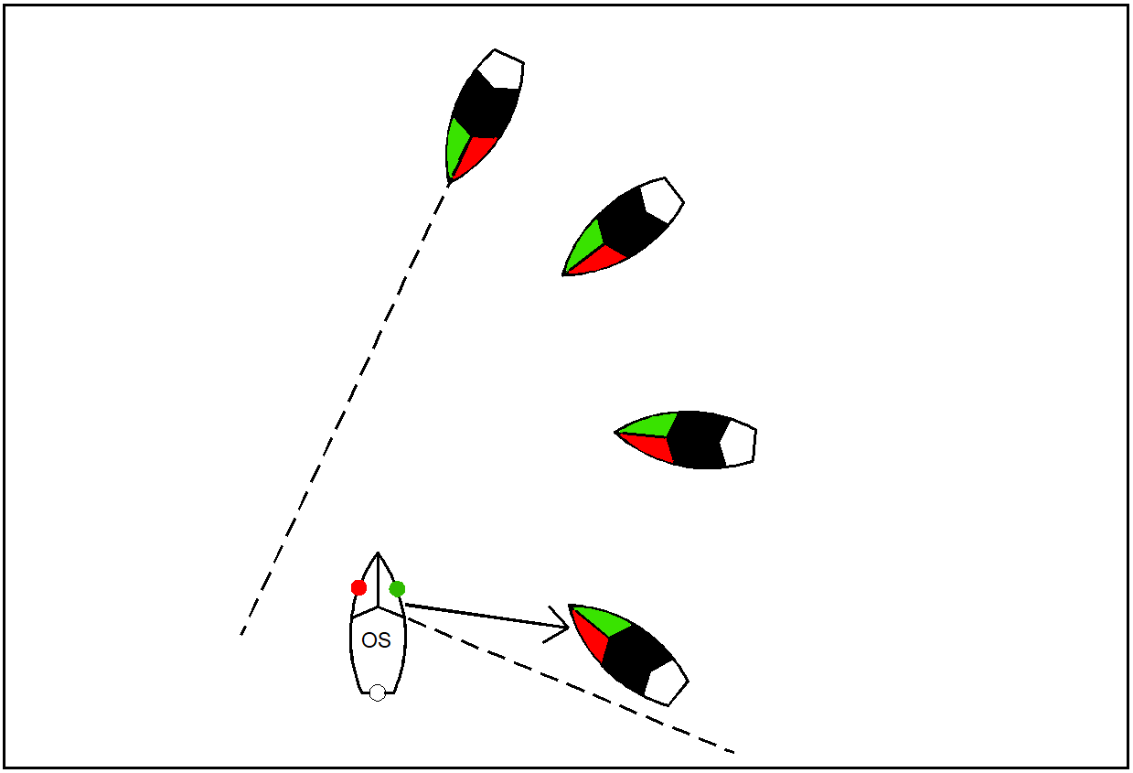 The red and green side lights have an arc of visibilty of 112.5 degrees from the bow leading aft. If a vessel can see your own ship's side light it is most likely what the rules refer to as a crossing situation.